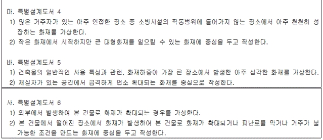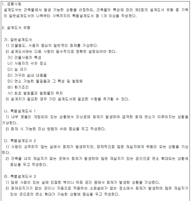 <2. 기술기준> 2.1 설계도서 작성 2.1.1 미분무소화설비의 성능을 확인하기 위하여 하나의 발화원을 가정한 설계도서는 다음의 기준 및 그림 2.1.1을 고려하여 작성되어야 하며, 설계도서는 일반설계도서와 특별설계도서로 구분한다. (1) 점화원의 형태 (2) 초기 점화되는 연료 유형 (3) 화재 위치 (4) 문과 창문의 초기상태(열림, 닫힘) 및 시간에 따른 변화상태 (5) 공기조화설비, 자연형(문, 창문) 및 기계형 여부 (6) 시공 유형과 내장재 유형