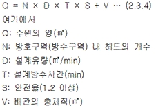 2.1.2 일반설계도서는 유사한 특정소방대상물의 화재사례 등을 이용하여 작성하고, 특별설계도서는 일반설계도서에서 발화 장소 등을 변경하여 위험도를 높게 만들어 작성해야 한다. 2.1.3 2.1.1 및 2.1.2에도 불구하고 검증된 기준에서 정하고 있는 것을 사용할 경우에는 적합한 도서로 인정할 수 있다. 2.2 설계도서의 검증 2.2.1 소방관서에 허가동의를 받기 전에 법 제46조제1항에 따라 성능시험기관으로 지정받은 기관에서 그 성능을 검증받아야 한다. 2.2.2 설계도서의 변경이 필요한 경우 2.2.1에 의해 재검증을 받아야 한다. 2.3 수원 2.3.1 미분무소화설비에 사용되는 소화용수는 「먹는물관리법」 제5조에 적합하고, 저수조 등에 충수할 경우 필터 또는 스트레이너를 통해야 하며, 사용되는 물에는 입자ㆍ용해고체 또는 염분이 없어야 한다. 2.3.2 배관의 연결부(용접부 제외) 또는 주배관의 유입측에는 필터 또는 스트레이너를 설치해야 하고, 사용되는 스트레이너에는 청소구가 있어야 하며, 검사ㆍ유지관리 및 보수 시에 배치 위치를 변경하지 않아야 한다. 다만, 노즐이 막힐 우려가 없는 경우에는 설치하지 않을 수 있다. 2.3.3 사용되는 필터 또는 스트레이너의 메쉬는 헤드 오리피스 지름의 80 % 이하가 되어야 한다. 2.3.4 수원의 양은 다음의 식 (2.3.4)를 이용하여 계산한 양 이상으로 해야 한다.