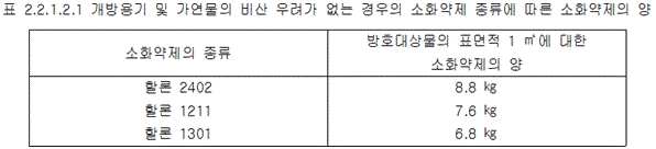 2.2.1.3 호스릴방식의 할론소화설비는 하나의 노즐에 대하여 다음 표 2.2.1.3에 따른 양 이상으로 할 것<개정 2023. 2. 10.>