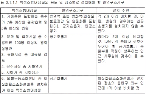 <2. 기술기준> 2.1 인명구조기구의 설치기준 2.1.1 인명구조기구는 다음의 기준에 따라 설치해야 한다. 2.1.1.1 특정소방대상물의 용도 및 장소별로 설치해야 할 인명구조기구는 표 2.1.1.1에 따라 설치할 것