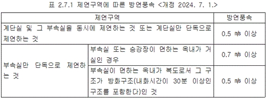 <2. 기술기준> 2.1 제연방식 2.1.1 이 기준에 따른 제연설비는 다음의 기준에 적합해야 한다. 2.1.1.1 제연구역에 옥외의 신선한 공기를 공급하여 제연구역의 기압을 제연구역 이외의 옥내(이하 "옥내"라 한다)보다 높게 하되 일정한 기압의 차이(이하 "차압"이라 한다)를 유지하게 함으로써 옥내로부터 제연구역 내로 연기가 침투하지 못하도록 할 것 2.1.1.2 피난을 위하여 제연구역의 출입문이 일시적으로 개방되는 경우 방연풍속을 유지하도록 옥외의 공기를 제연구역 내로 보충 공급하도록 할 것 2.1.1.3 출입문이 닫히는 경우 제연구역의 과압을 방지할 수 있는 유효한 조치를 하여 차압을 유지할 것 2.2 제연구역의 선정 2.2.1 제연구역은 다음의 어느 하나에 따라야 한다. 2.2.1.1 계단실 및 그 부속실을 동시에 제연하는 것 2.2.1.2 부속실을 단독으로 제연하는 것 2.2.1.3 계단실을 단독으로 제연하는 것 2.2.1.4 <삭제 2024. 7. 1.> 2.3 차압 등 2.3.1 2.1.1.1의 기준에 따라 제연구역과 옥내와의 사이에 유지해야 하는 최소차압은 40 ㎩(옥내에 스프링클러설비가 설치된 경우에는 12.5 ㎩) 이상으로 해야 한다. 2.3.2 제연설비가 가동되었을 경우 출입문의 개방에 필요한 힘은 110 N 이하로 해야 한다. 2.3.3 2.1.1.2의 기준에 따라 출입문이 일시적으로 개방되는 경우 개방되지 않은 제연구역과 옥내와의 차압은 2.3.1의 기준에도 불구하고 2.3.1의 기준에 따른 차압의 70 % 이상이어야 한다. 2.3.4 계단실과 부속실을 동시에 제연하는 경우 부속실의 기압은 계단실과 같게 하거나 계단실의 기압보다 낮게 할 경우에는 부속실과 계단실의 압력 차이는 5 ㎩ 이하가 되도록 해야 한다. 2.4 급기량 2.4.1 급기량은 다음의 양을 합한 양 이상이 되어야 한다. 2.4.1.1 2.1.1.1의 기준에 따른 차압을 유지하기 위하여 제연구역에 공급해야 할 공기량. 이 경우 제연구역에 설치된 출입문(창문을 포함한다. 이하 "출입문등"이라 한다)의 누설량과 같아야 한다. 2.4.1.2 2.1.1.2의 기준에 따른 보충량 2.5 누설량 2.5.1 2.4.1.1의 기준에 따른 누설량은 제연구역의 누설량을 합한 양으로 한다. 이 경우 출입문이 2개소 이상인 경우에는 각 출입문의 누설틈새면적을 합한 것으로 한다. 2.6 보충량 2.6.1 2.4.1.2의 기준에 따른 보충량은 부속실의 수가 20개 이하는 1개 층 이상, 20개를 초과하는 경우에는 2개 층 이상의 보충량으로 한다. <개정 2024. 7. 1.> 2.7 방연풍속 2.7.1 방연풍속은 제연구역의 선정방식에 따라 다음 표 2.7.1의 기준에 적합해야 한다.